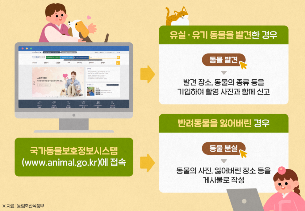요즘에는 반려동물 키우는 분들도 많으시죠? 반려동물을 잃어버렸을 경우, 또는 유실/유기동물을 발견했을 경우에는 국가동물보호정보시스템에 접속해서 신고할 수 있습니다.