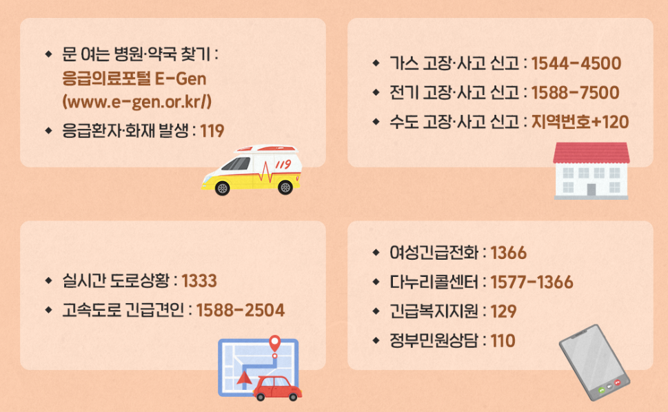 연휴에는 대부분 문을 닫기 때문에 긴급상황이 발생하면 어디로 연락해야 하는지 당황스러울 때가 있습니다. 응급환자가 발생하거나 사고가 발생했을 때는 국번없이 119에 연락하면 되지만 그 외의 상황에서는 어디다 연락해야 할지 모르는 분들이 많으실 겁니다.