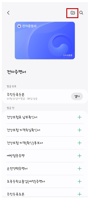 7. 전자증명서 서비스를 통해 발급 받을 수 있는 항목들이 화면 하단에 나열됩니다. 주민등록등본 발급을 위해 우측 플러스 버튼을 클릭합니다.