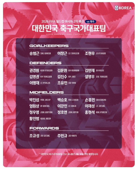 2026 월드컵 아시아 지역 예선은 홈 경기와 어웨이 경기로 진행됩니다. 따라서 3월 21일 서울 상암경기장에서 경기가 펼쳐진 뒤 3월 26일 태국 원정경기가 이루어집니다.